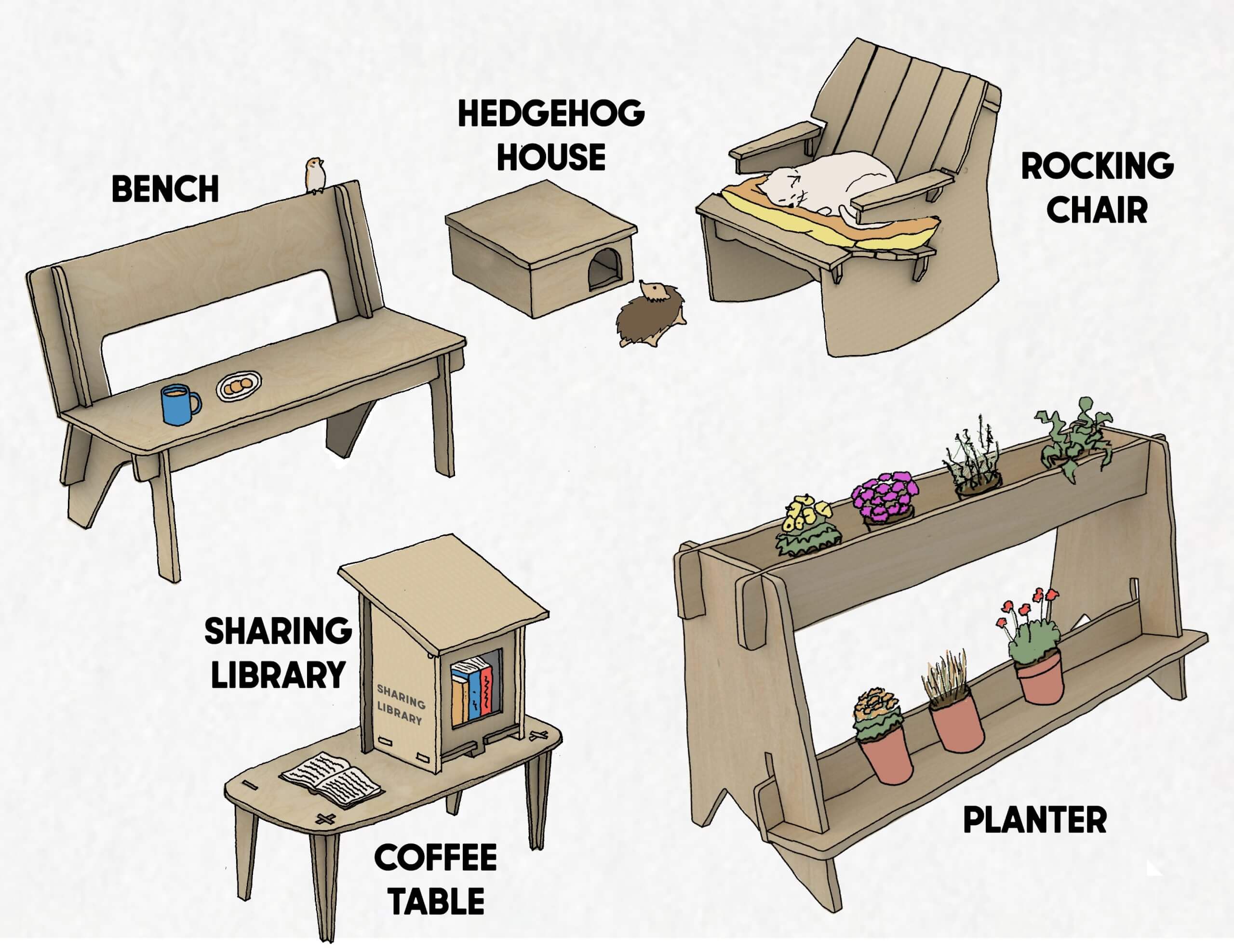 Together with local people, we co-designed a set of furniture – the Front Garden Retrofit Kit – to create space for nature and social life in our front gardens. The furniture in the kit was designed in partnership with Texas-based Better Block, and can be cut by practically any workshop with a CNC router (basically, a robot!). The kit is completely open-source for you to download and use, supporting communities across the UK and further afield to manufacture their own Library of Social Infrastructure.